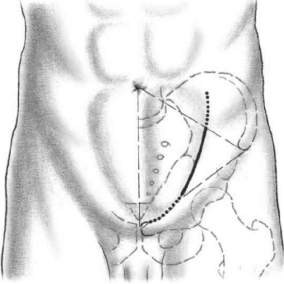 皮肤切口:沿髂嵴从后方的臀中肌附丽点开始,弧形延至耻骨联合上方2cm。对于体型较瘦的患者,切口可选择在髂嵴远端以避免切口的张力