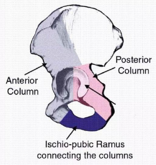 前柱组成:髂嵴,髂棘,髋臼前半和耻骨。后柱组成:坐骨,坐骨棘,髋臼后半和形成坐骨切迹的密质骨。