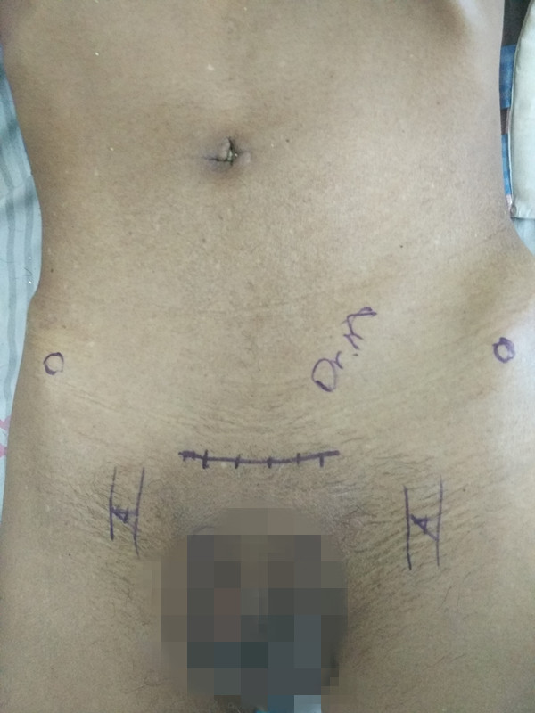 体位:仰卧位。切口:横行或纵行切口横切口。横行切口:耻骨联合上2cm,长度不超过7-8cm;纵行切口:脐下2cm至耻骨联合上2cm,适于同时行腹腔探查。