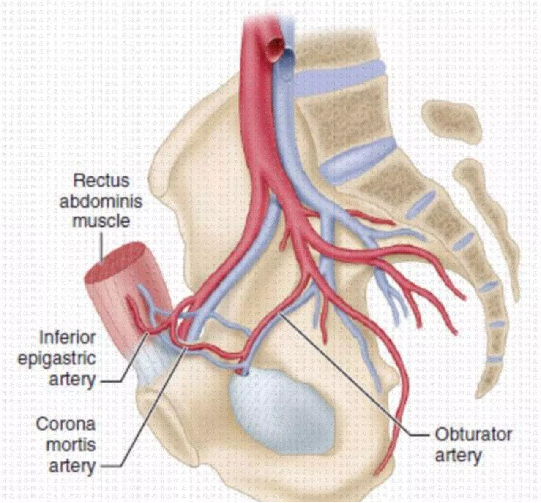 死亡冠(Corona mortis / crown of death)髂外血管与闭孔动脉的交通支部分是腹壁下动脉与闭孔动脉的交通支