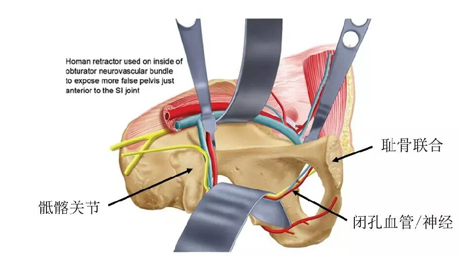 第二窗可以显露骶髂关节至耻骨支外1/3的骨盆缘和四边体。牵拉血管束时必须轻柔。