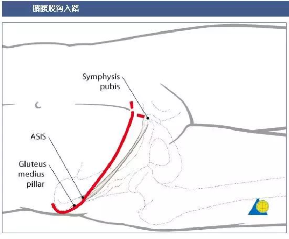 按红色箭头入路1)腹直肌;2)腹外斜肌和腹横肌的内侧和外侧;3)髂腰肌;4)腰大肌脐水平(1)耻骨肌和;(2)闭孔内肌髋水平。