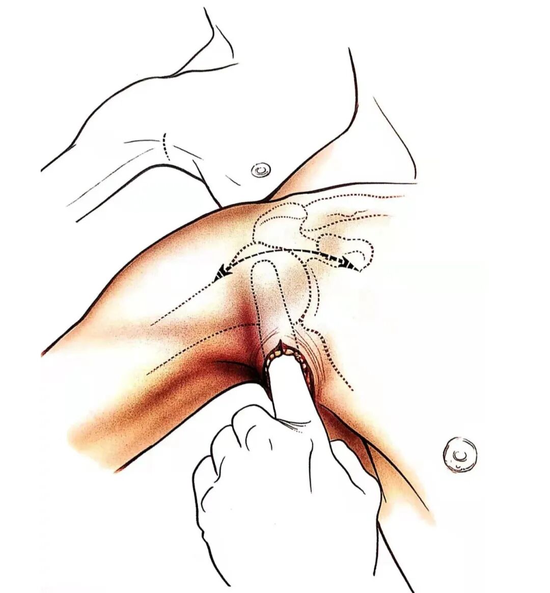 - 患者仰卧,肩关节外展并外旋90°。用无菌记号笔标记出腋前皱襞。切口起自腋前皱襞的中点,朝后向腋窝部延长8-10cm。用手指探入皮下潜行分离,尤其是在上方三角肌胸大肌间沟附近。以头静脉作为标记可以明确在垂直面上的位置。向上外侧牵开皮瓣,即可显露三角肌胸大肌间沟。