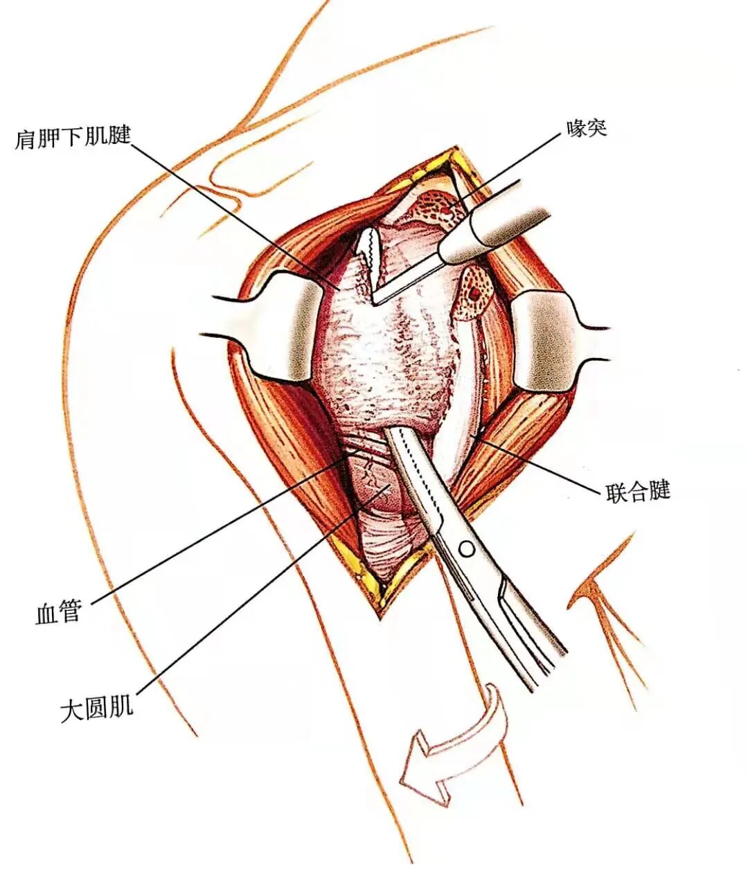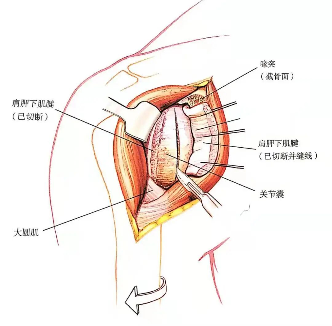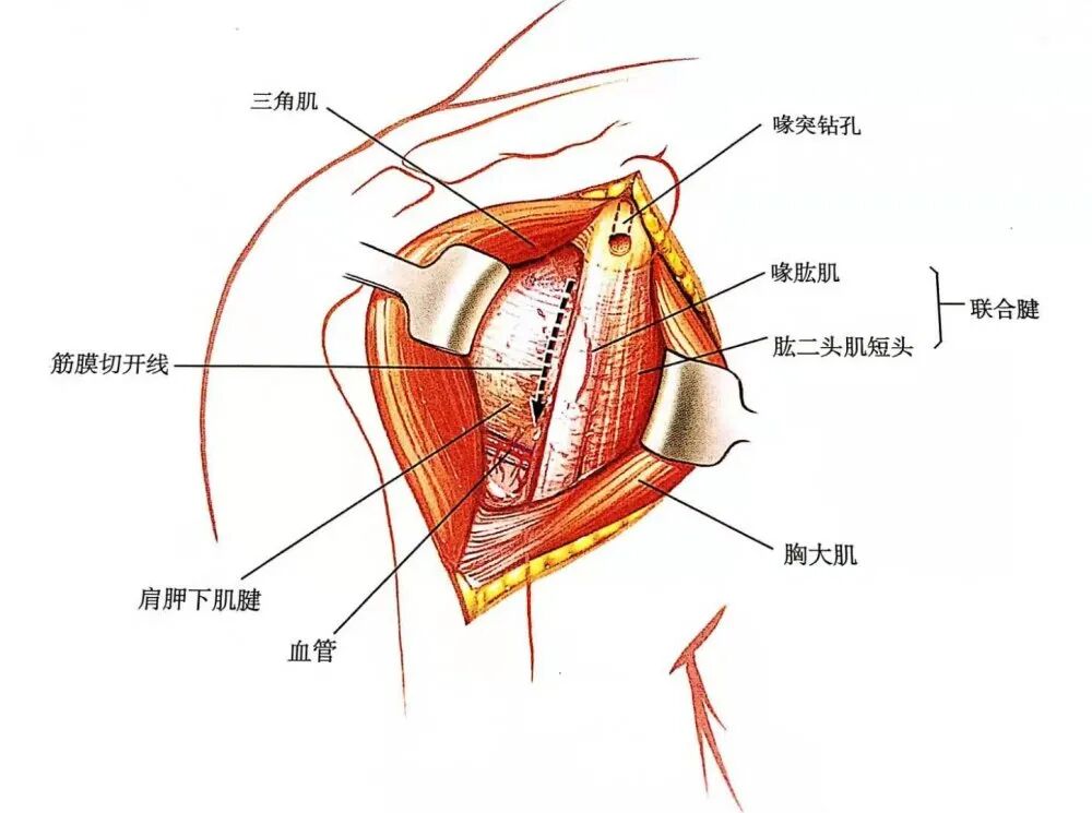 - 如需更充分地显露,或如果要移动喙突,可将这两个肌腱从喙突起点处切断。也可以将喙突的顶端截下,切下的喙突术毕可用螺丝钉固定于原位,也可用粗丝线缝合。