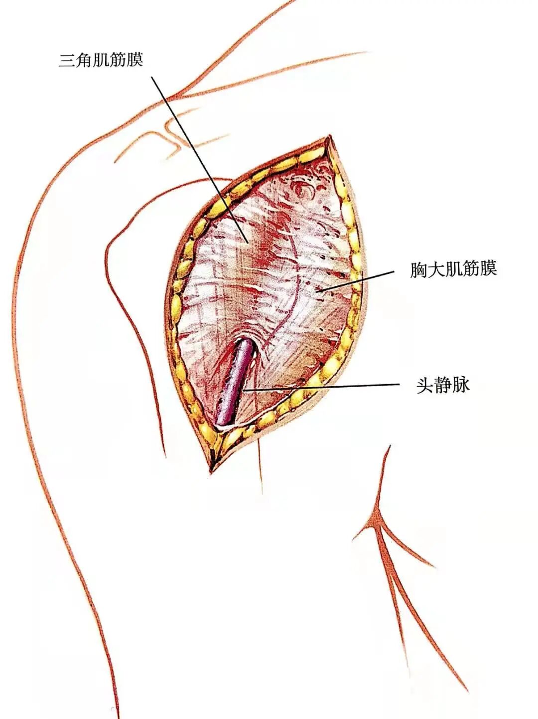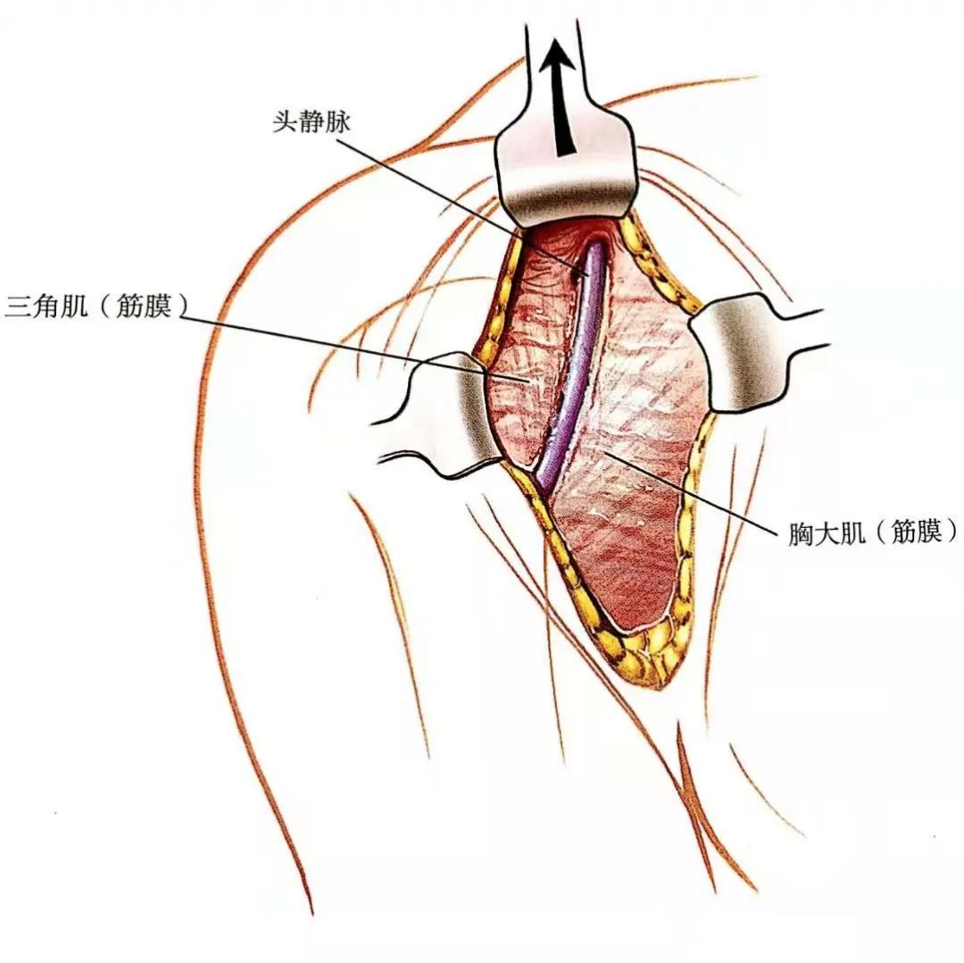 - 向内侧牵开胸大肌,向外侧牵开三角肌,将这两块肌肉分开,头静脉向内侧或外侧牵开均可。