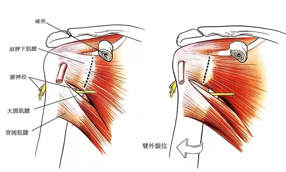 ▲ 过度向下牵拉喙突及附着其上的肌腱会损伤肌皮神经,导致肌皮神经麻痹或撕裂