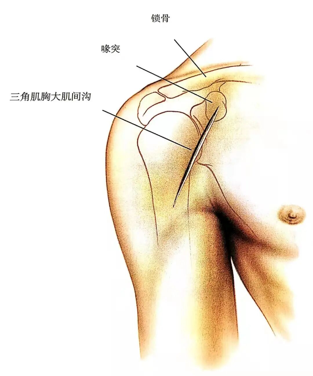 ▲ 辨明胸大肌筋膜和三角肌筋膜间的沟。头静脉有助于确定该肌间沟的位置