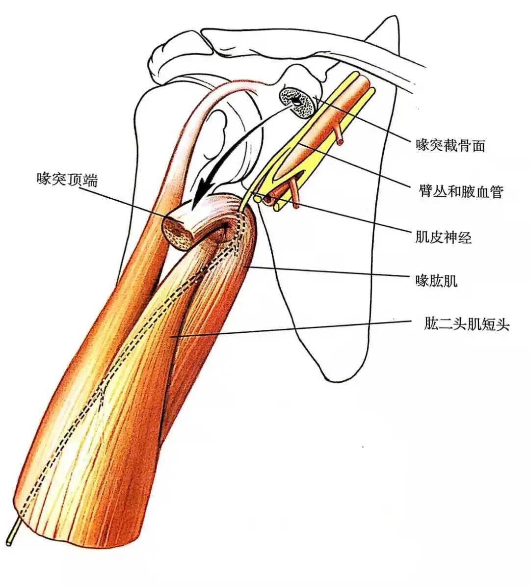 - 进入肩关节前方,必须将肱二头肌短头(肌皮神经支配)和喙肱肌(肌皮神经支配)移向内侧。