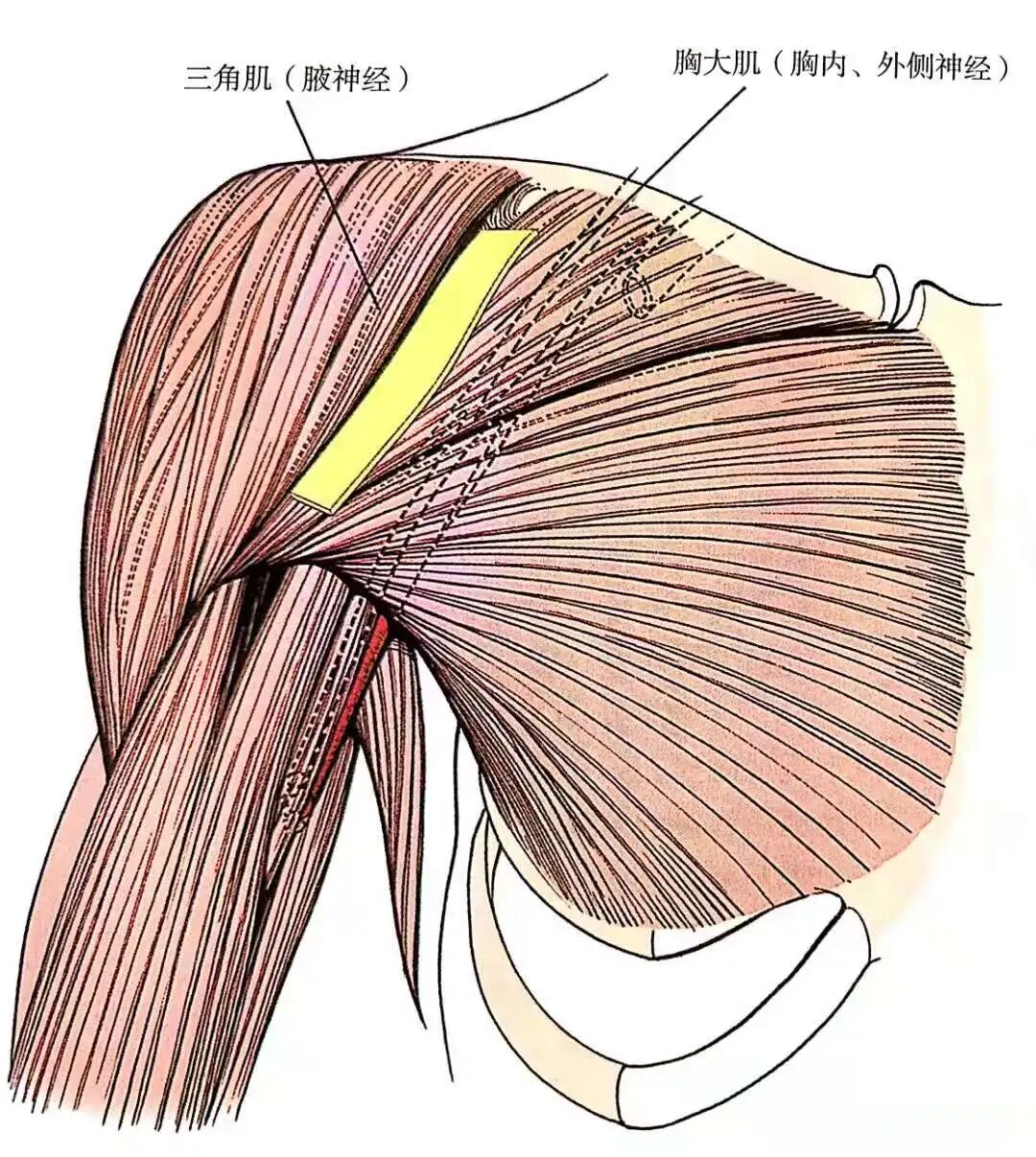 ▲ 神经间平面位于三角肌(腋神经)与胸大肌(胸内、外侧神经)之间