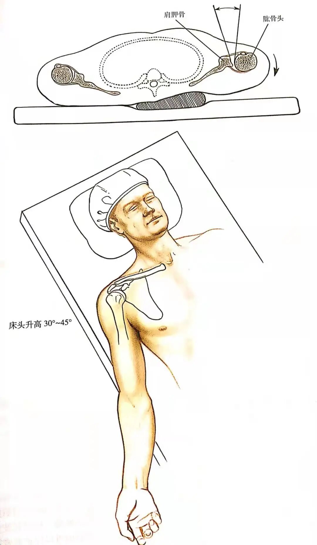▲ 肩关节前侧入路时患者的体位。手术床头端升高30°~45°,在肩胛骨内侧缘和脊柱下方置一沙袋,使肩关节外旋,关节前间隙张开