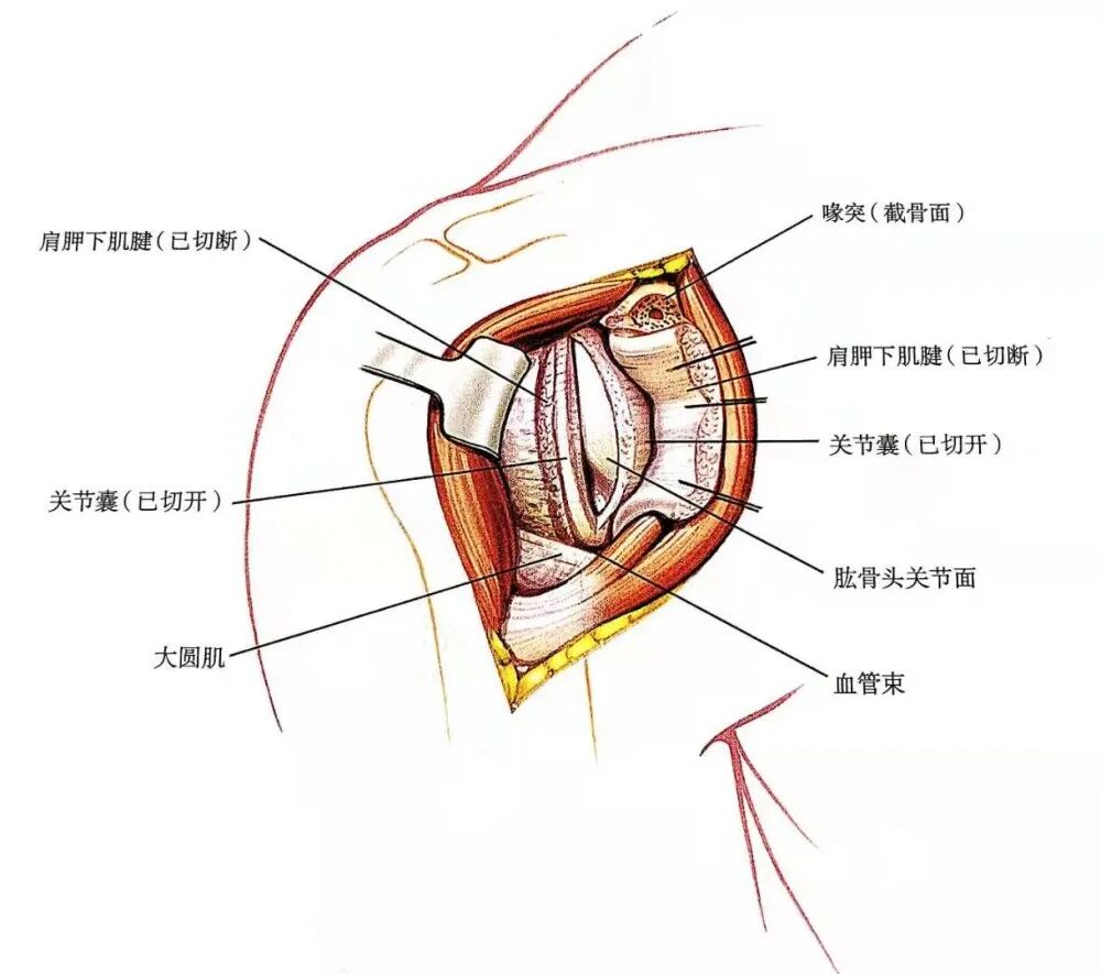 - 需要注意的是,肩胛下肌的部分肌纤维止于关节囊上,在切断肌肉时,稍不注意会切开关节囊,因为这两层结构一般不易分清。