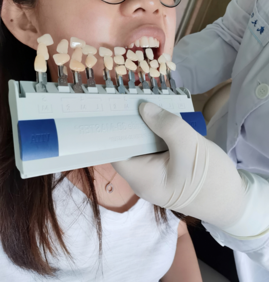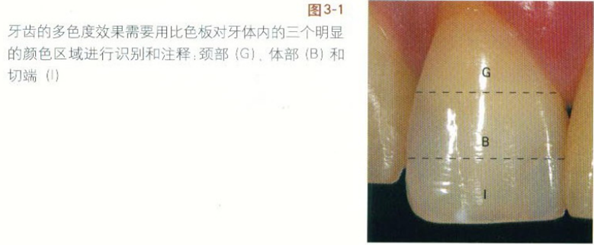 单颗牙齿而言,切端具有半透明的性质,颈部又受牙龈颜色影响,一般是以牙齿中部决定主色调,牙齿颜色从切端到颈部逐渐改变,有学者用分光光度计测量95颗离体牙发现颈中切三部分颜色差别明显。