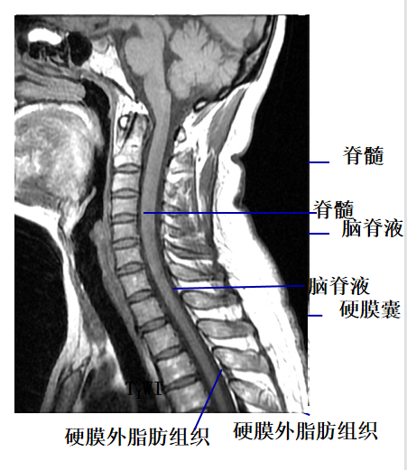 脊髓:位于椎管中心呈中等信号影脑脊液