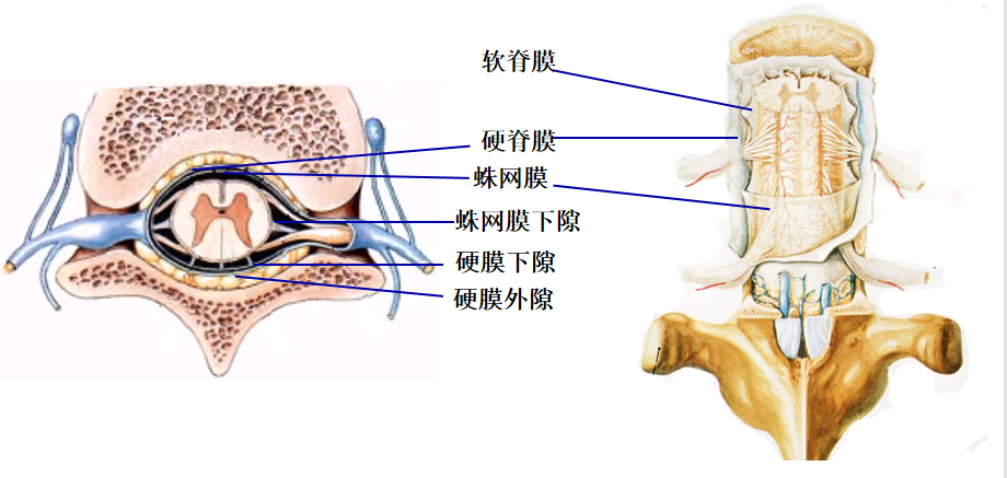 被膜间隙(外→内):硬膜外隙、硬膜下隙、蛛网膜下隙
