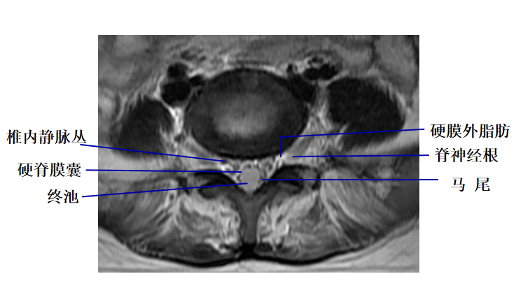 脊神经根:中等信号条状或圆点状影。硬膜外脂肪组织