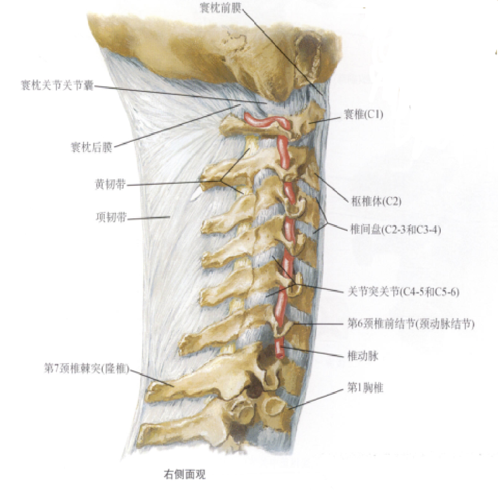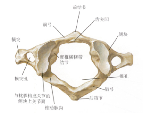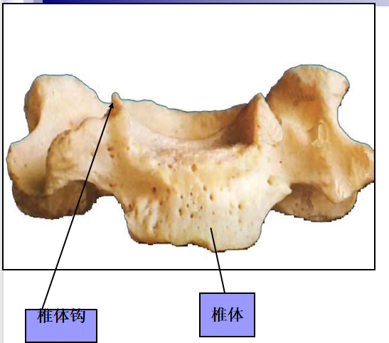 寰椎呈环状,无椎体,第2-6颈椎的棘突较短,末端分叉,第7颈椎棘突长,末端不分叉