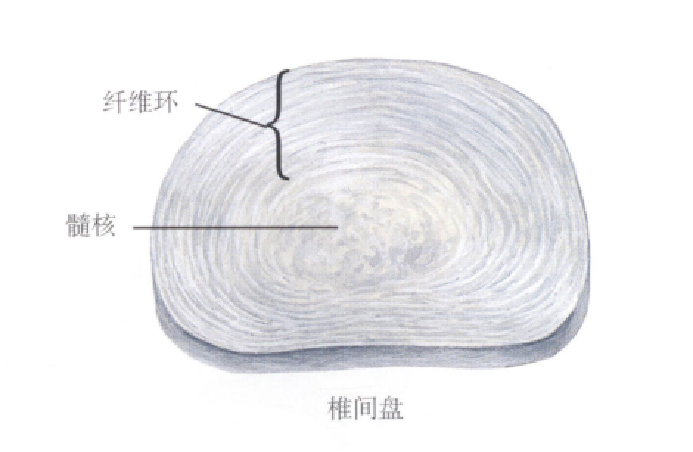 椎间盘:由髓核、纤维环和软骨板三部分构成,其中髓核为中央部分,纤维环为周围部分,包绕髓核,软骨板为上、下部分,直接与椎体骨组织相连