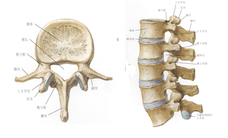 脊柱的发育是由中胚层的生骨节细胞围绕脊髓和脊索形成的。人类幼年时椎骨共有33块(颈椎7块,胸椎12块,腰椎5块,骶椎5块,尾椎4块)。随年龄增长5块骶椎合成一块骶骨, 4块尾椎合成一块尾骨。