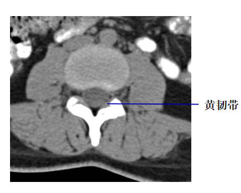 - 黄韧带较厚(正常时≤3 mm),位于椎板和关节突的内侧面,密度高于硬脊膜囊和硬膜外脂肪,显示较清晰