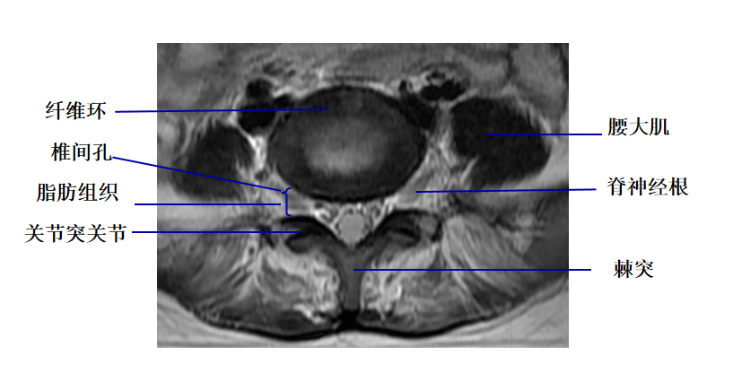 充填椎间孔的脂肪组织呈高信号;行走于其中的脊神经根呈圆形、长圆形低或等信号影