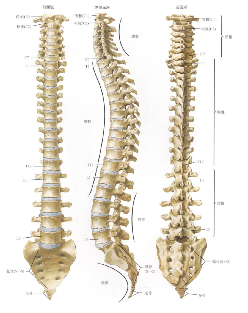 侧面观:可见颈、胸、腰、骶四个生理性弯曲,颈和腰曲凸向前,胸和骶曲凸向后。