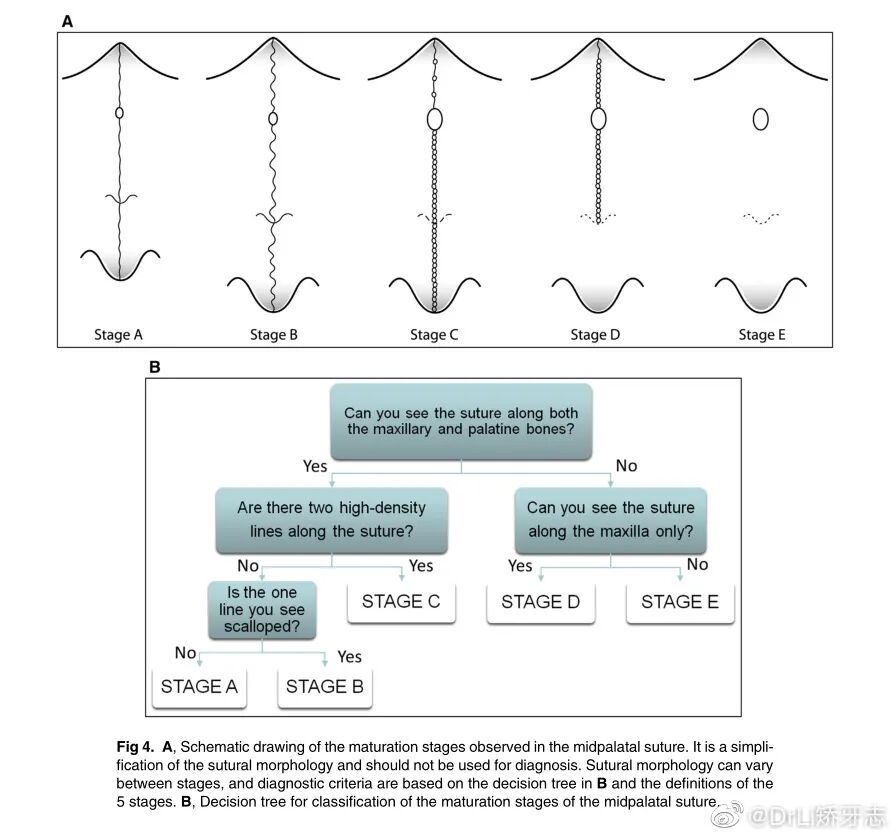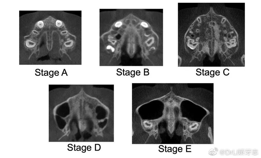 D期:在腭中缝前部可见两条锯齿状高密度线,腭中缝后部(腭骨处)模糊。