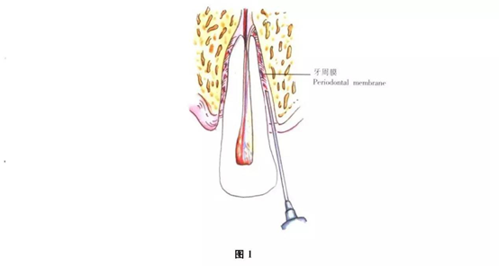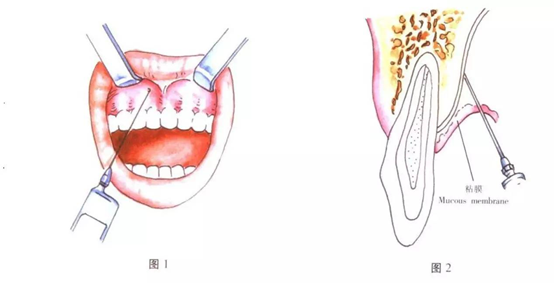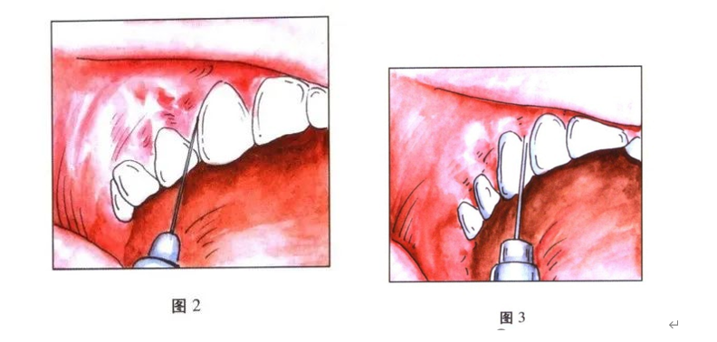 将短而细的注射针自牙的近中侧和远中侧刺入牙周膜,深约0.5cm,注药0.5ml,即可麻醉牙及牙周组织(图1-3)。
