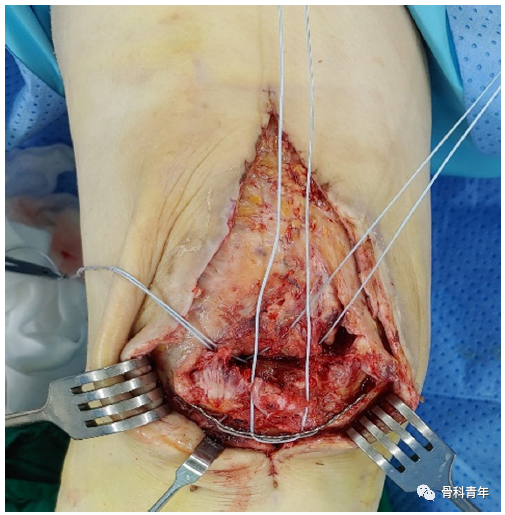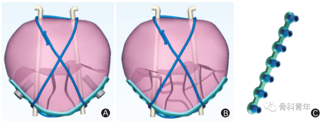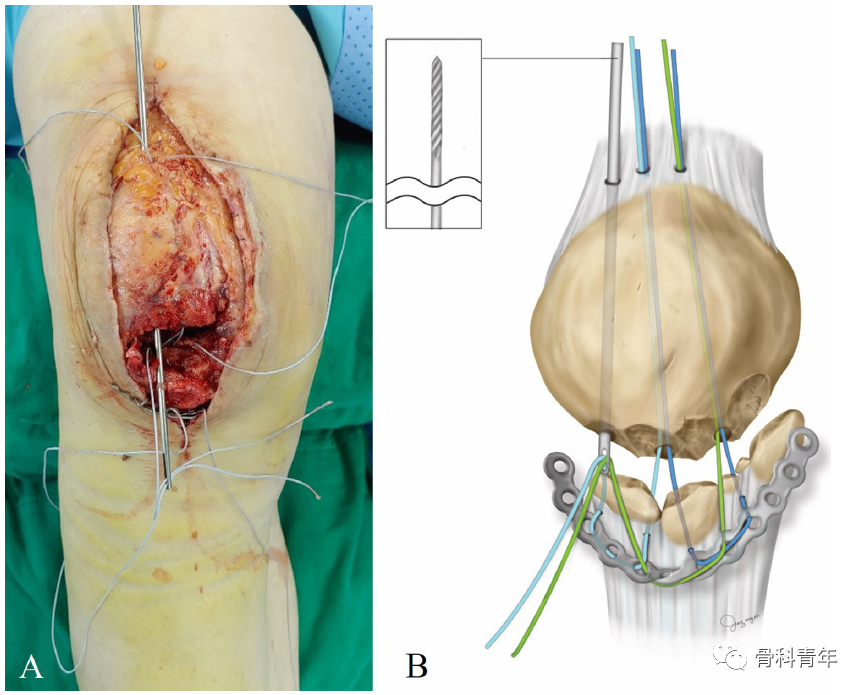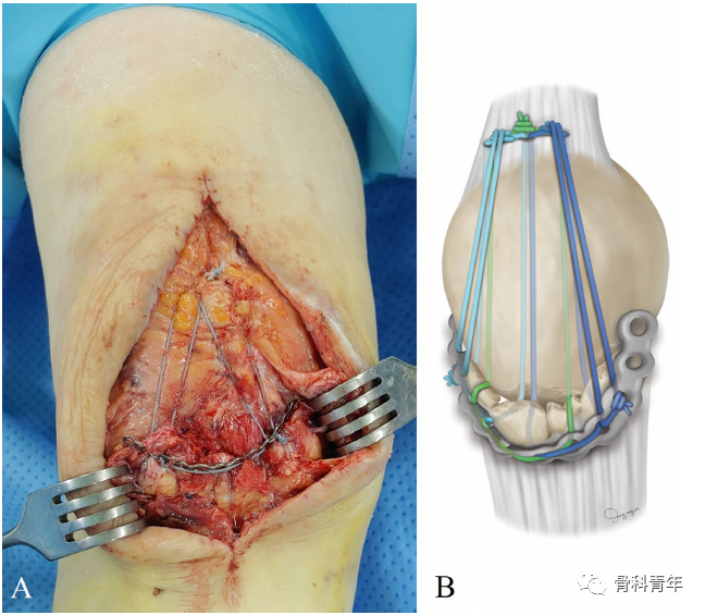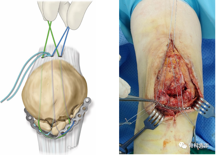 韩国学者的手术方式,是采用12孔的低切迹钢板,将钢板放置于髌韧带表面,将缝线穿过钢板孔,绕过下极粉碎骨块的前方和后方,经髌骨近端骨块钻孔穿出。