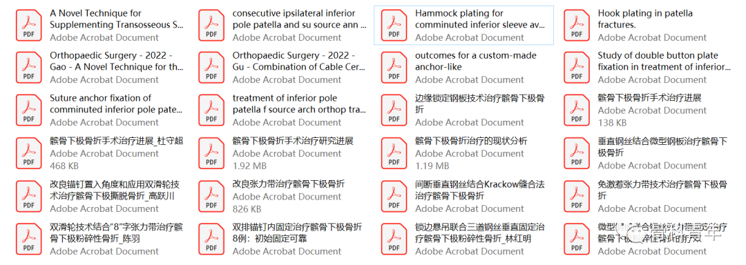 髌骨下极骨折属关节外骨折,由于下极粉碎骨折骨块小,主流克氏针张力带无法有效固定,在临床治疗上较为棘手,除髌骨下极切除外,目前对髌骨下极粉碎性骨折的固定主要有以下几种方式,螺钉固定+钢丝或钛揽保护,锚钉联合缝线,异型钢板(蓝状,网状,或星形等),以及各种改良的张力带等。
