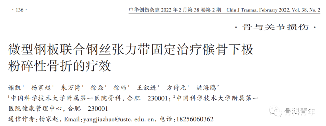 髌骨下极骨折属关节外骨折,由于下极粉碎骨折骨块小,主流克氏针张力带无法有效固定,在临床治疗上较为棘手,通过在髌骨下极横行放置钢板,将髌骨下极粉碎骨折“兜”成整体继而使用传统克氏针张力带方法固定,是近年来治疗髌骨下极粉碎骨折的新方法。