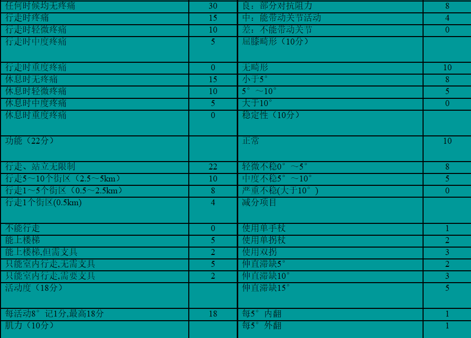 4.膝关节评分纽约特种外科医院(HSS)膝关节评分标准。该量表评分总分为100分,共分为7个项目,其中6个为得分项目,1个为减分项目。
