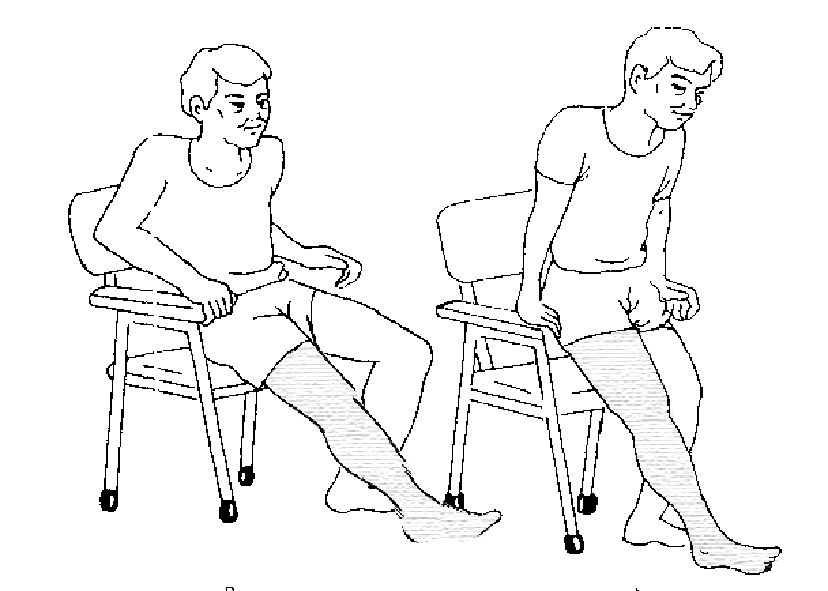4)膝关节活动度练习:患者坐于轮椅内,术侧足触地,双手轻轻地向前方推动轮椅,使膝关节被动屈曲,并维持6秒钟,然后,患者主动抬腿伸膝,并维持6秒钟。