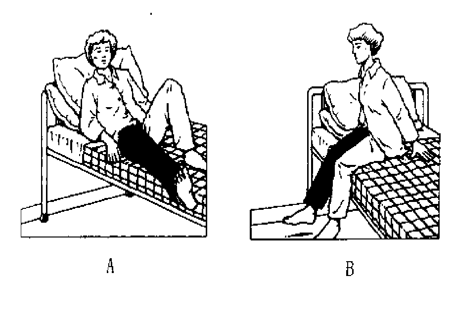 2.康复治疗(1)术后当日~第3天:主要是控制疼痛、肿胀、预防感染及血栓形成,促进伤口愈合。1)术后固定:用石膏后托固定术侧膝关节于伸直位,并抬高患肢(尽可能平心脏水平),从足趾至腹股沟处以弹性压力绷带包扎,可以预防水肿及膝关节屈曲挛缩。2)术后疼痛处理:①药物;②冷冻疗法;③穿刺抽吸积液。3)深呼吸和有效咳嗽训练:同髋关节置换术后的康复。4)踝“泵”运动:同髋关节置换术后的康复。5)按摩:对术侧下肢做缓和的按摩,从肢体远端至近端。