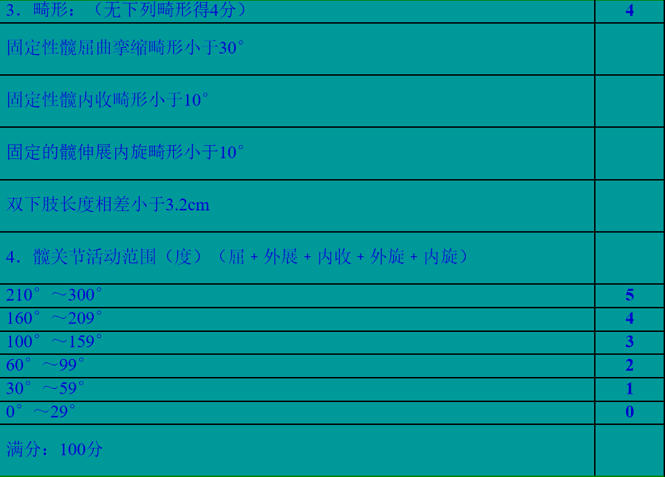 髋关节功能分为4级:70分以下为差; 70~79分为一般;80~89分为良; 90~100分为优。