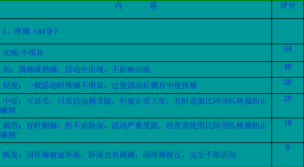 术后评定 1.心脏功能和呼吸功能状况。2.伤口情况 3.关节肿胀4.关节疼痛 5.神经系统检查6.X线检查 测量假体的位置对判断松动和下沉指导康复训练和研究物理治疗对预防中、远期并发症的治疗作用具有一定的指导意义。7.关节活动度 8.肌力 9.活动及转移的能力 10.分析步态 11.评定患者功能性活动能力 可采用Harris髋关节评分。 12.门诊随访 主要了解髋关节的稳定性和髋关节的活动度。