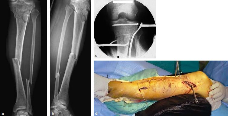 a 一例胫骨多段骨折患者;b 正确的进钉点可以达成满意的复位和力线