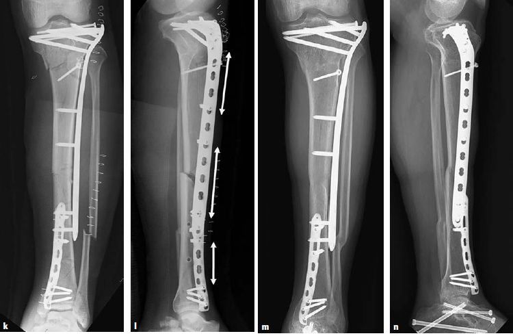 术后X线的力线可以接受。注意骨折的每个部分,工作长度都长达3个螺孔(双头箭头)。拉力螺钉打入近端骨折区来维持楔形骨块。但是一般来说,并不推荐在桥接区域放置拉力螺钉,因为它可能会妨碍跨骨折区的微动,从而妨碍骨折愈合。远端内侧的钢板位置稍微偏前以避免和外侧锁定板的螺钉钉道发生冲突。所有的骨折最终均平稳愈合