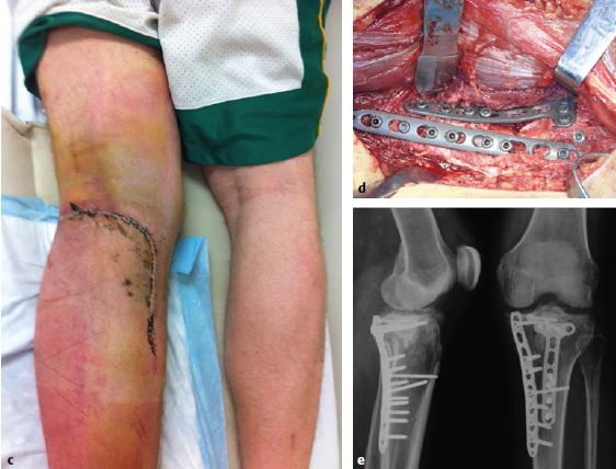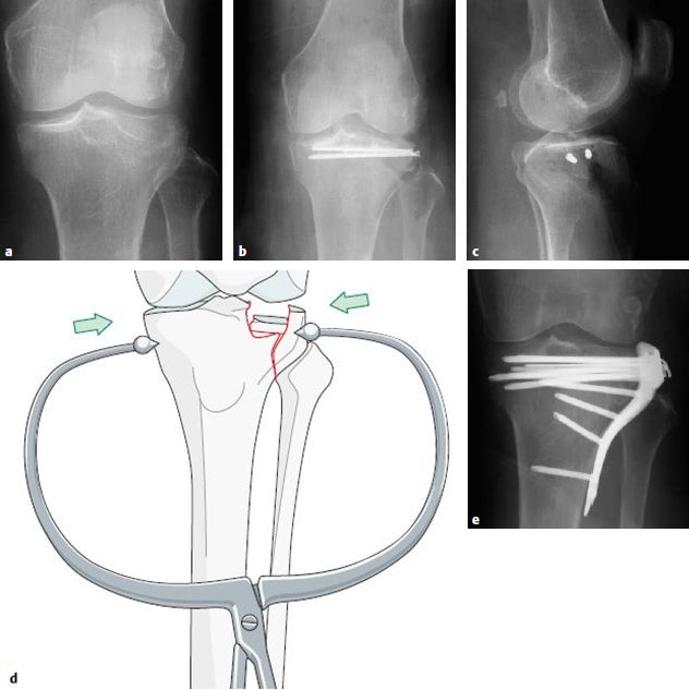 a 关节面塌陷;b-c 两枚2.7mm锁定螺钉维持复位后关节面;d 使用大的骨盆复位钳来复位胫骨平台劈裂骨折;e 额外的外侧锁定钢板提供排钉支撑