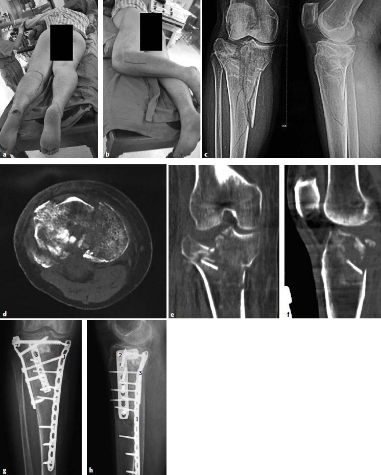 图6.8.1-25 a-h 三柱骨折一名59岁女性机动车车祸时右腿发生了复杂的胫骨平台骨折a-b 漂浮体位下的联合入路;c 术前X线;d CT轴位片;e CT冠状位提示内、外侧柱均受累;f CT矢状位提示后侧柱骨折;g-h 术后X线。钢板1用来支撑内侧柱以防止发生内翻;钢板2用来复位外侧平台和关节;钢板3用来复位和固定胫骨平台的后侧中央区域