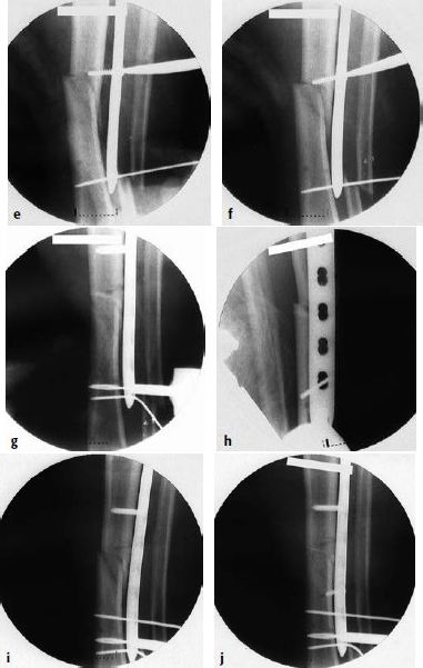 股骨牵开器或外固定架可以帮助间接复位。若胫骨平台骨折累及胫骨干,术中需要牵引利用软组织整复术以纠正短缩、旋转和成角畸形。借助锁定加压钢板的结合孔,打入皮质螺钉有助于骨折复位的最终调整;也可以发挥钢板的支撑功能来作为骨折复位的工具(图6.8.1‑16e)。