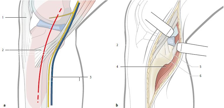 分离并提起全厚皮瓣,暴露时注意保护隐神经和小隐静脉。钝性分离暴露腓肠肌内侧头,贴着后胫骨后内侧边界切开腓肠肌内侧头的深部筋膜,筋膜切开后,从胫骨后方提起并向外侧牵拉腓肠肌内侧头,这样可以保护腘血管神经束并暴露骨折,后侧柱以及后方膝关节囊。避免过度向后外侧腓骨的方向剥离,因为这样容易损伤腘动脉的分叉(图6.8.1‑5b),若把拉钩放置在腓骨颈周围,也有可能损伤腓总神经。