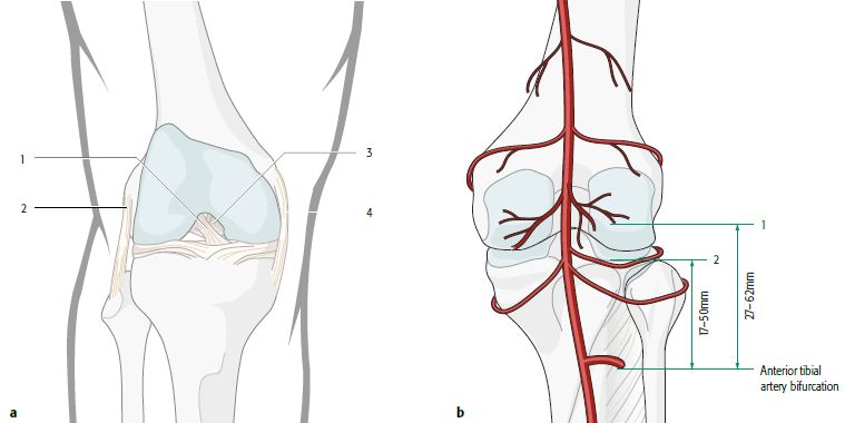 b 胫后动脉双分叉。该分叉位于外侧平台(1)远侧27‑62mm,位于腓骨头(2)远侧17‑50mm。它向远端继续走行成为胫后动脉和腓动脉。此处可能存在解剖变异,胫腓干动脉可能并不存在,因此所有的三条动脉(胫前、胫后、腓动脉)都起源于同一处,形成一个三分叉。