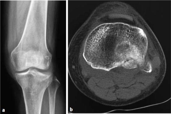内侧胫骨平台骨折形态以「整块移位」居多,关节面的损伤不那么严重(a);外侧胫骨平台骨折更常见,可能伴有关节面的塌陷和粉碎(b)