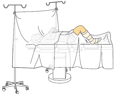 患者放置于仰卧位。大腿帮上止血带,仅在需要时充气。在术前准备阶段用手对患肢保持轻微的牵引。使用合适的消毒剂对大腿中部至足部的暴露区进行消毒。患肢的铺巾采用一次性U形铺巾或四肢铺巾。足部和小腿采用弹力织物包裹并使用胶贴固定(图6.8.1‑9)。