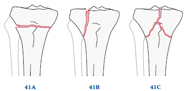 41A 胫骨,近端,关节外骨折;41B 胫骨,近端,部分关节骨折;43C 胫骨,近端,完全关节内骨折