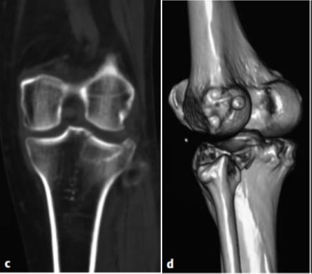 a CT冠状位图像显示外侧平台的劈裂-塌陷骨折;b CT横断位显示外侧平台前外侧关节面的严重缺失;c-d 三维CT图像