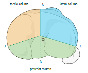 一项近来提出的手术理念将胫骨近端分为三个柱:外侧柱、内侧柱以及后侧柱。每个「柱」都包含了其对应的关节面部分及支撑的干骺端骨质。该理念有助于理解骨折的类型、规划手术的入路并指导放置各柱的支撑钢板[9](图6.8.1‑6)。
