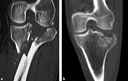 外侧柱骨折由伸膝‑外翻暴力造成,因此后续的复位和支撑固定必须防止外翻畸形的再发生。推荐采用前外侧入路。单纯劈裂型骨折(41B1.1)可以通过拉力螺钉、支撑钢板或更常用的二者之联合来进行固定。劈裂合并塌陷型(41‑B3.1)是指外侧柱骨折合并关节面塌陷,完善的术前检查(例如,CT扫描)是精确评估关节面损伤的关键(图6.8.1‑20),将塌陷的骨块复位后,克氏针临时固定有助于稳定关节面,骨折的最终固定最好使用钢板,拉力螺钉可以单独或者经钢板联合应用。