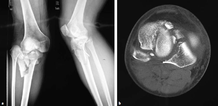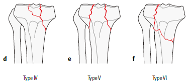 该类型的骨折通常由高能量创伤造成,伴发的并发症较多,可同时累及内侧柱和外侧柱或者是所有三个柱。除了造成髁部的骨折,骨折也可能延伸至骨干部,并有很高的风险发生骨筋膜室综合症和严重的软组织损伤。许多这类骨折需要一期应用跨膝外固定支架多日以等待软组织平稳。