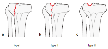 大多数该类型的损伤发生于外侧平台,他们通常被描述为平台的局部压缩。该类型骨折的诊断必须仰仗CT扫描,因为常规X线检查无法很好的判断塌陷的程度与位置[5]。完全恢复塌陷关节面的高度非常重要,因为该类型骨折容易发生术后再塌陷、轴向力线丢失和外翻畸形。这类骨折最好通过排钉技术和钢板进行治疗,术中关节镜也可以帮助判断复位情况。